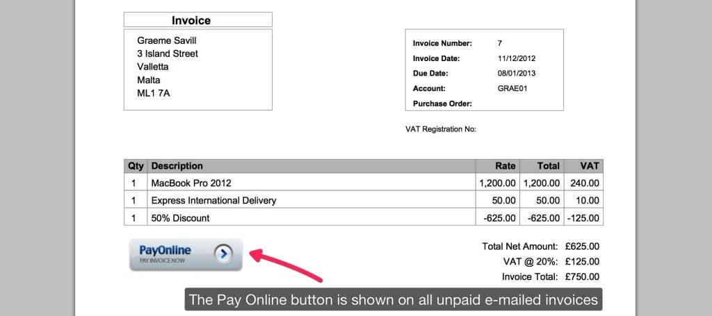 Combine Kashflow with one of several well known payment processors to enable the pay online button. This makes it even easier for customers to pay their invoices.