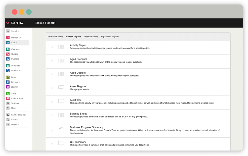 If you just want a quick overview of your finances, there are even more reports, including; balance sheet, asset register, customer purchase history, monthly profit and loss and self-assessment are just a few. With KashFlow’s updated reports you can easily: