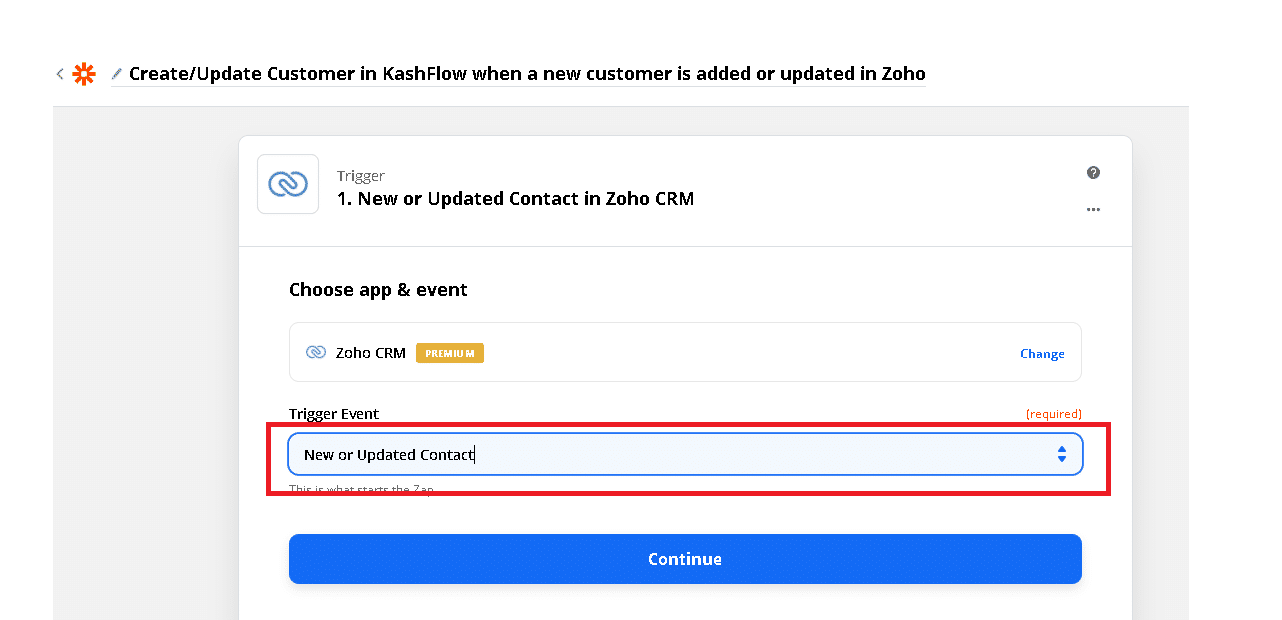 You may select any event, which is exposed by the source application. Since we want to create a customer in KashFlow, when a new contact is created/updated in Zoho CRM, let’s select ‘New or Updated Contact’ event.