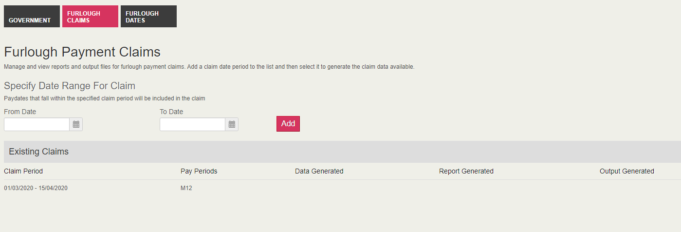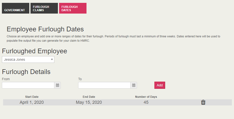• Click on Add to record the furlough period – this will be used in the claims calculation
