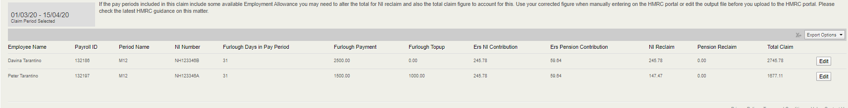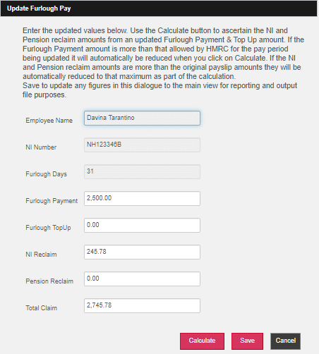 Note: SOME MANUAL CHANGES REQUIRED: Some claim amounts may need to be altered manually by the maximum allowed by HMRC for a pay period, or due to a pro rata of furlough days. Check the latest HMRC guidance on this matter.